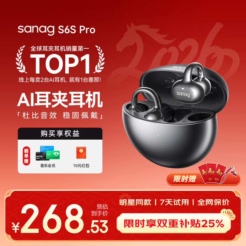 SANAG塞那S6S Pro蓝牙耳机耳夹式无线耳机开放式听力保护运动跑步通话降噪耳夹ai耳机
