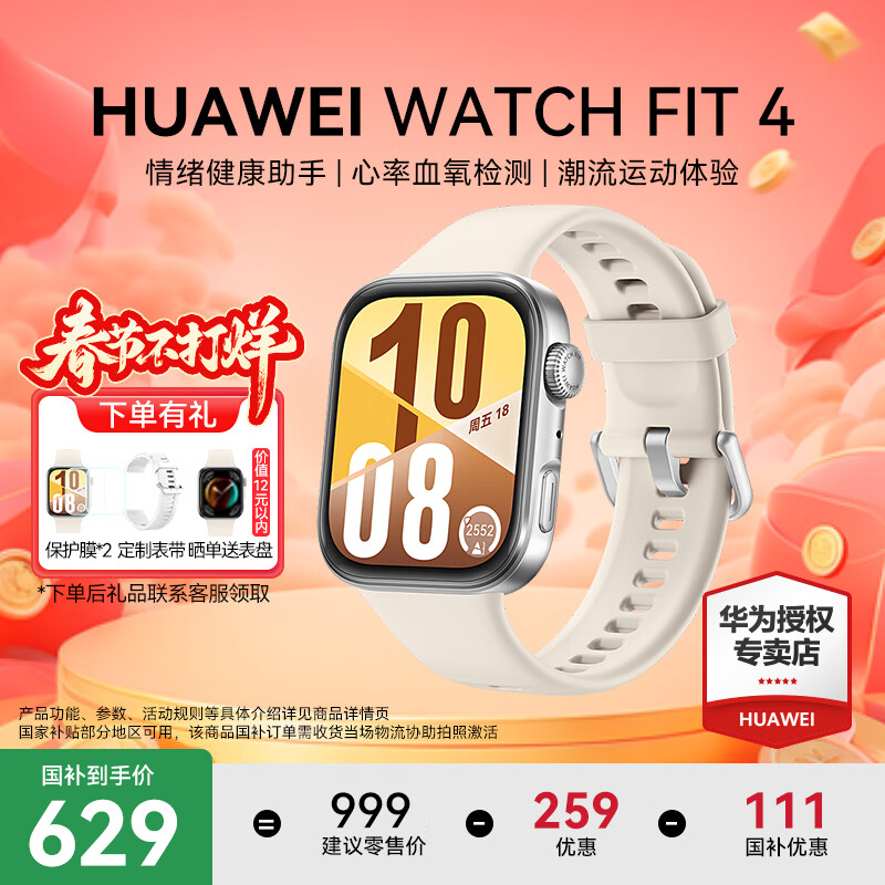 华为(HUAWEI)【春节送货】WATCH FIT 4智能手表运动蓝牙通话轻薄大屏高中学生健康管理NFC门禁男女心率 悦动白【甄选表带+表盘】(腕围130-210mm)