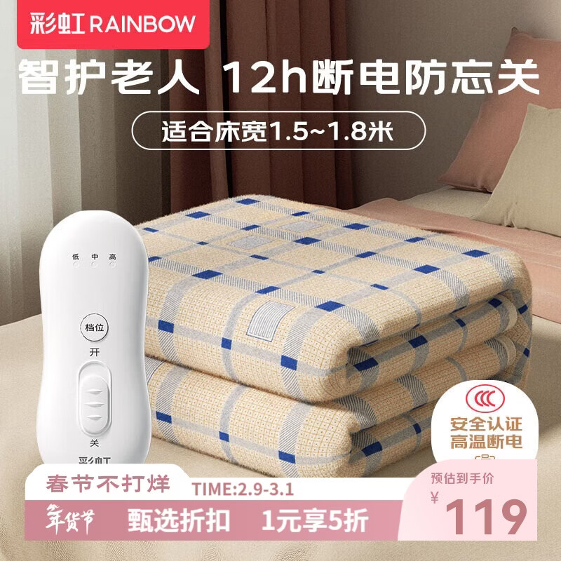彩虹【高温断电】暖梦双人防忘关四档调控电热毯电褥子1.8*1.5米