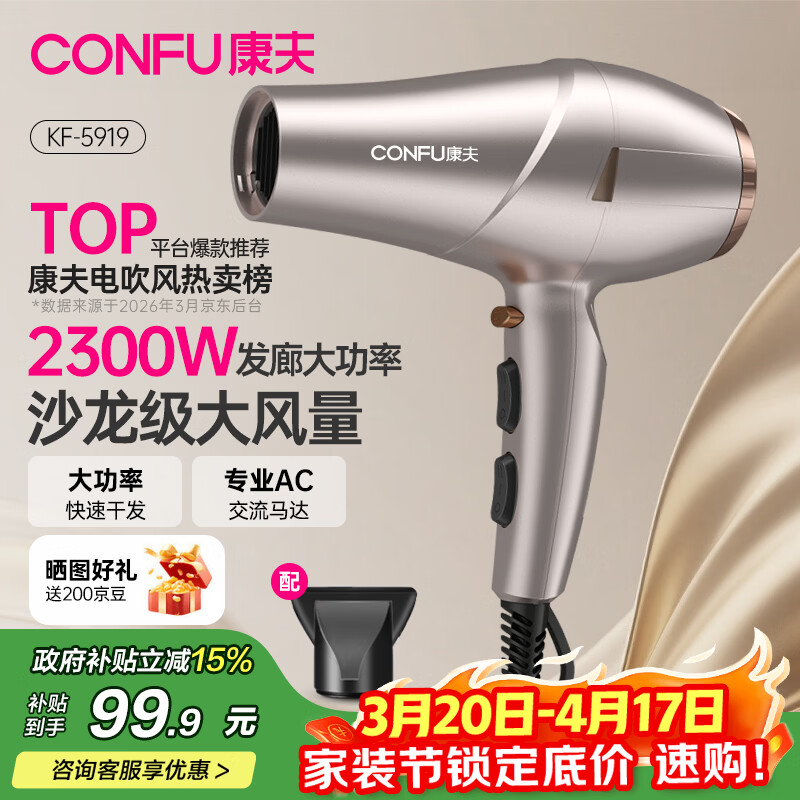 康夫(CONFU)电吹风机家用2300W大功率恒温速干专业发廊理发店造型吹风筒生日礼品节日礼物KF-5919 【恒温护发】2300W金色
