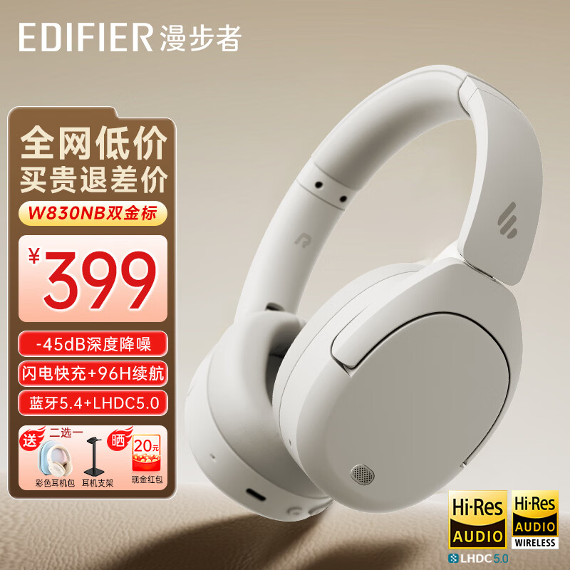 漫步者(EDIFIER)W830NB头戴式无线蓝牙耳机主动降噪双金标升级版超长续航HiFi游戏通话跑步高音质耳麦节日礼物 晨曦白