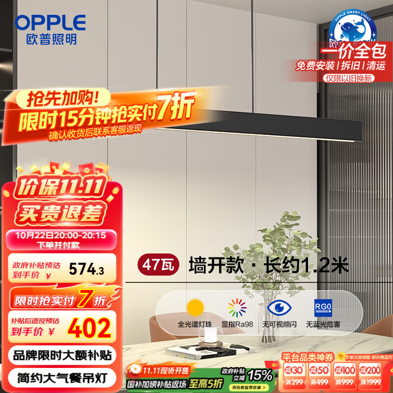 欧普(OPPLE)全光谱智慧光护眼高亮一字长条餐吊灯高显色现代简约大气黑色47W