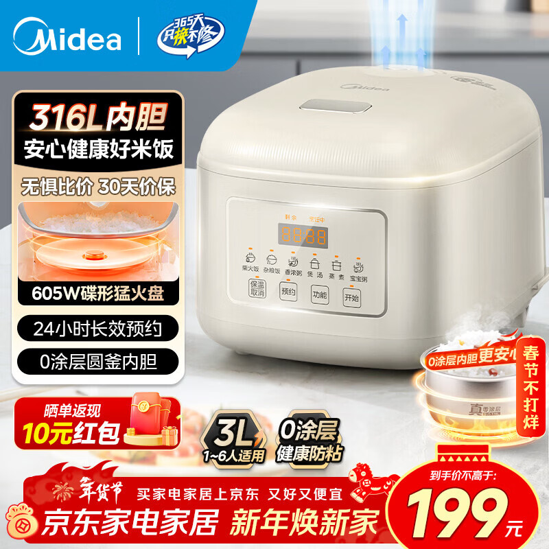 美的(Midea)电饭煲电饭锅家用商用柴火饭多功能预约小型迷你煮饭2-3-5-8人大容量不锈钢内胆不易粘锅年货好物 0涂层 3L 母婴级316L不锈钢内胆卡其灰偏白