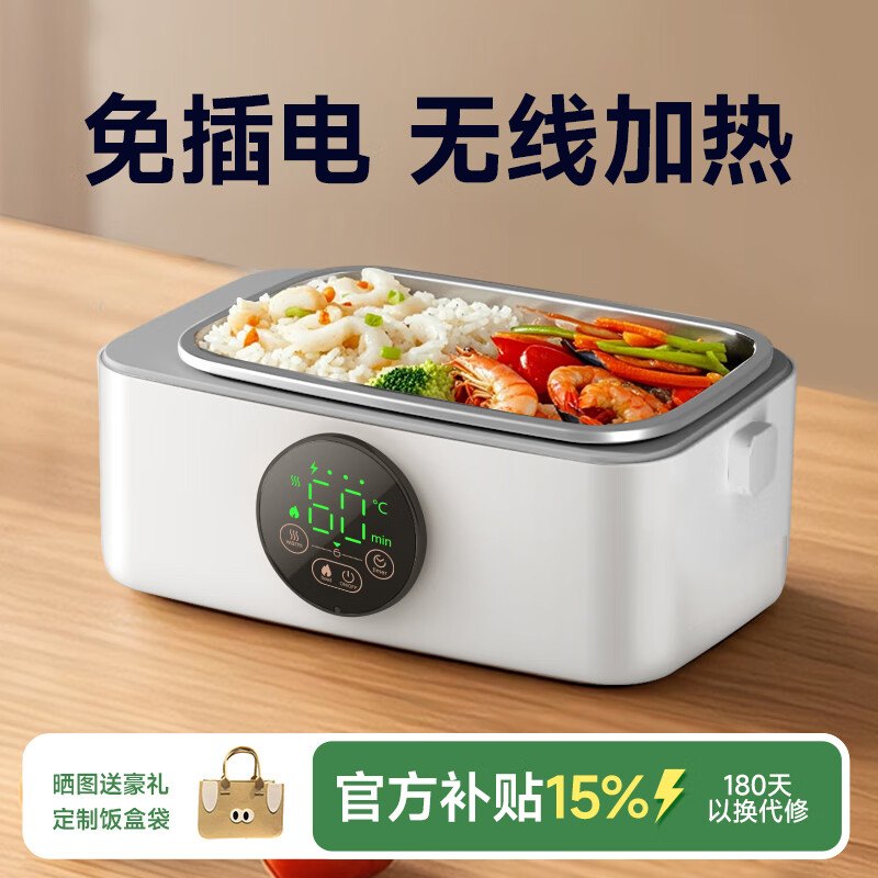 物克无线加热饭盒便当智能温控定时不插电免注水自热饭菜神器usb充电保温上班学生电热饭盒 1L 白色【18W快充/16000毫安+食品级内胆】