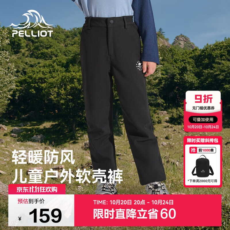 伯希和(Pelliot)户外儿童软壳裤冲锋春季男女保暖登山裤防风裤长裤23930709黑160