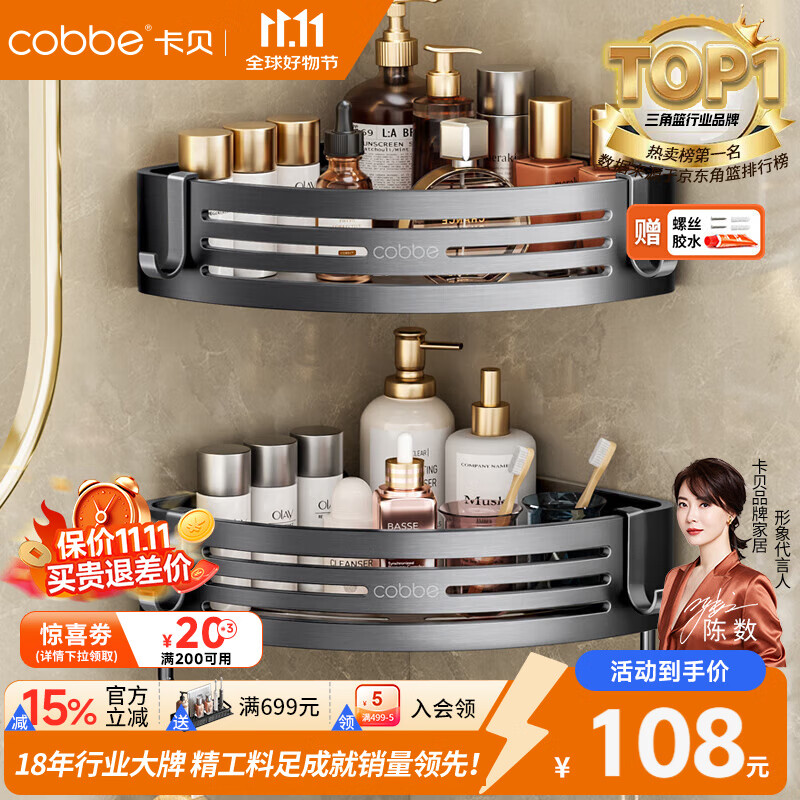 卡贝(cobbe)浴室置物架太空铝卫生间免打孔转角三角篮厕所墙角洗漱用品收纳架