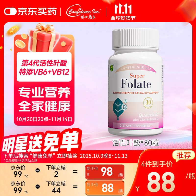 Confidence USA信心 康乐活性叶酸400mcg 复合维生素B6B12男女士备孕营养30粒/瓶