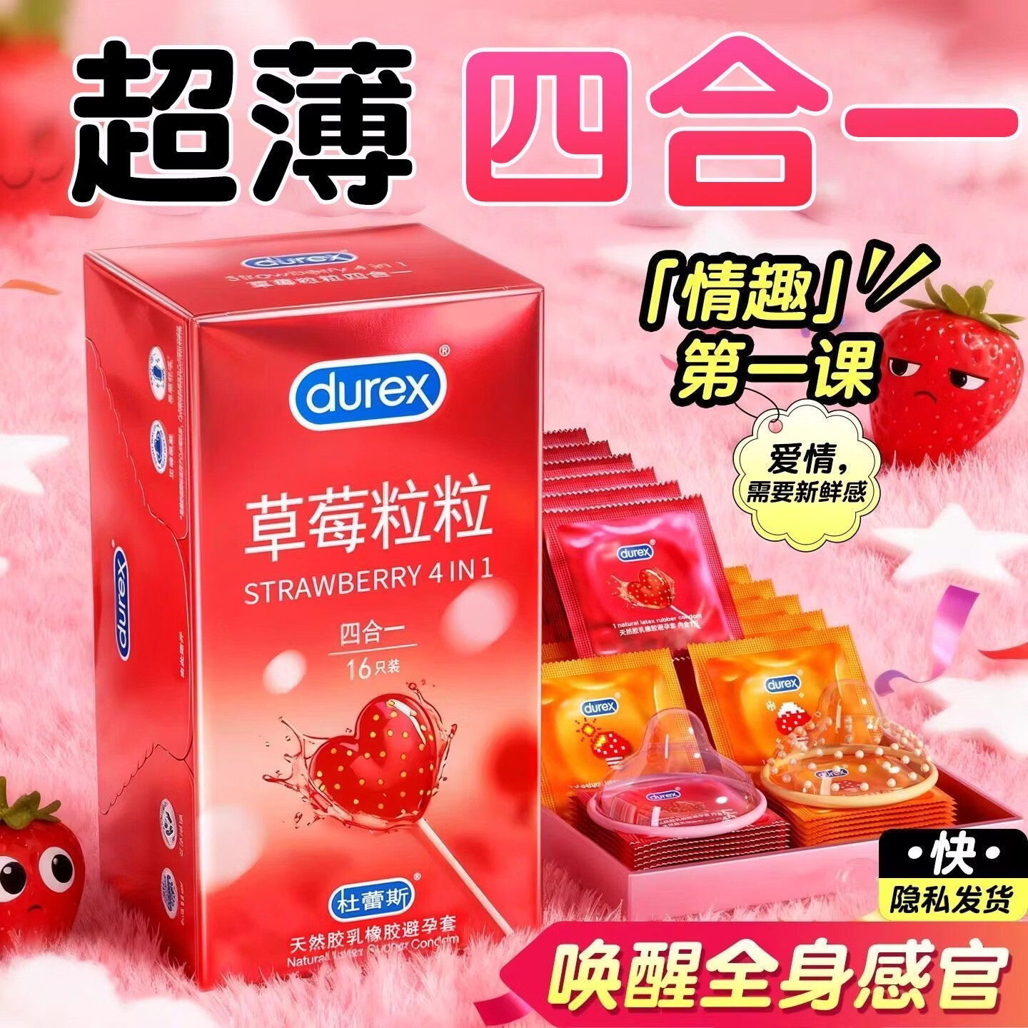 杜蕾斯(durex)草莓粒粒四合一避孕套 颗粒带刺阴螺纹凸点男女用安全套 情趣用品 甜蜜草莓【16只】草莓粒粒四合一16