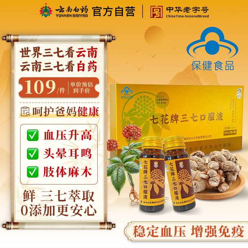 云南白药三七口服液30ml*7辅助降血压增强免疫力缓解体力疲劳