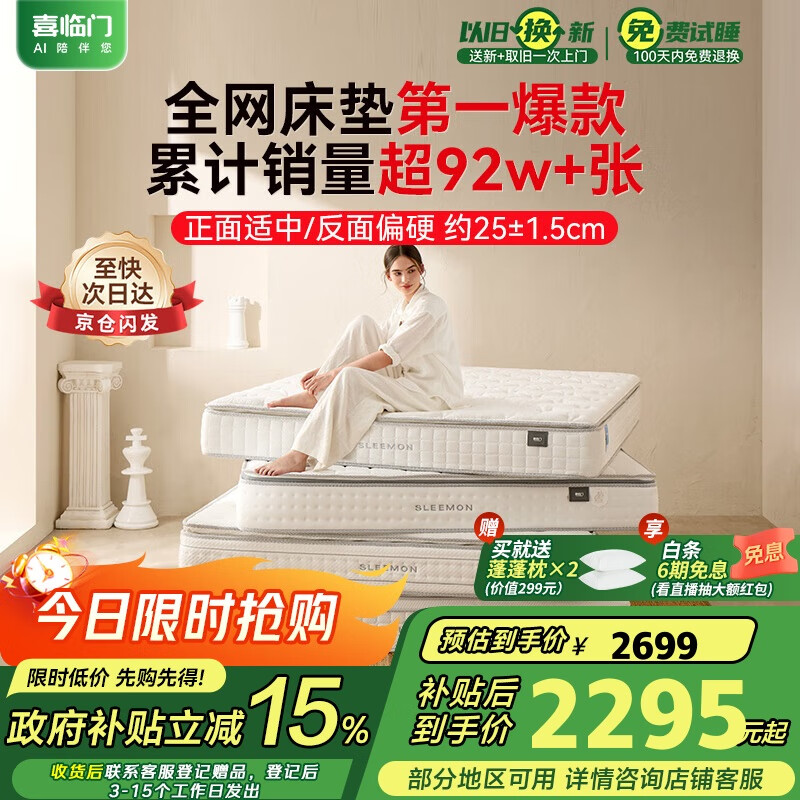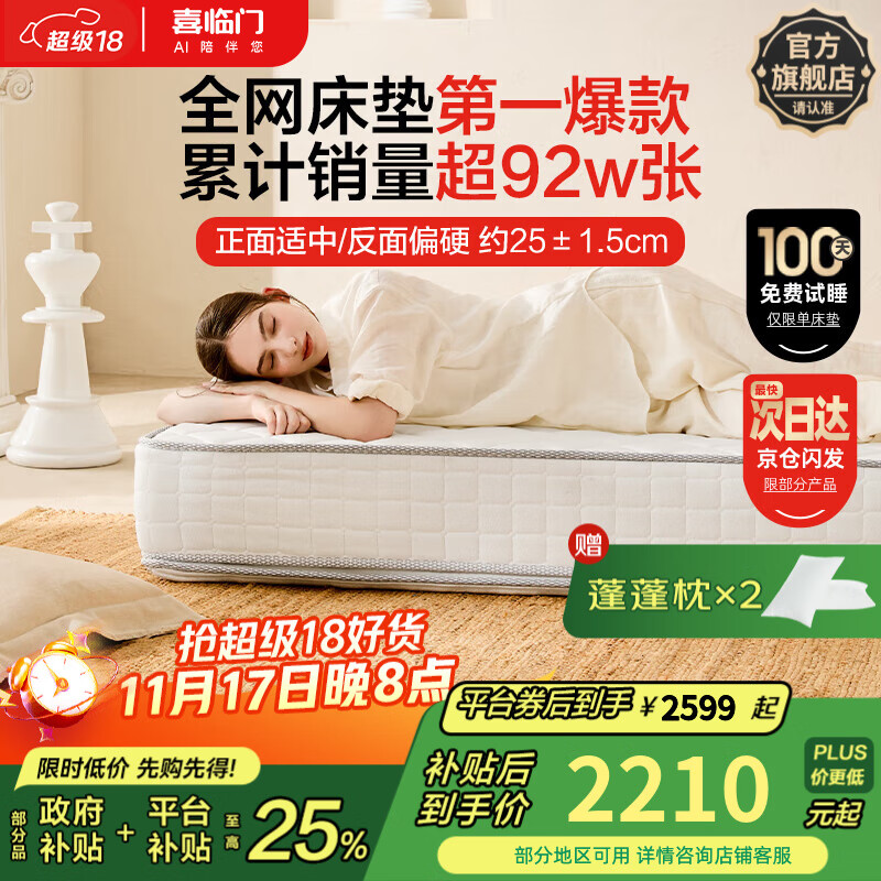 喜临门2cm高纯乳胶独袋弹簧床垫舒脊黄麻床垫白骑士plus1.8x2米软硬适中