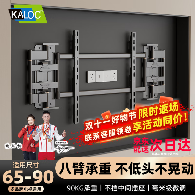 卡洛奇(kaloc)【新型结构不挡插座】超薄内嵌双臂伸缩电视机支架壁挂架可伸缩旋转适配100寸海信小米TCL电视85寸 NX90 超薄3.4厘米 适配65-90吋