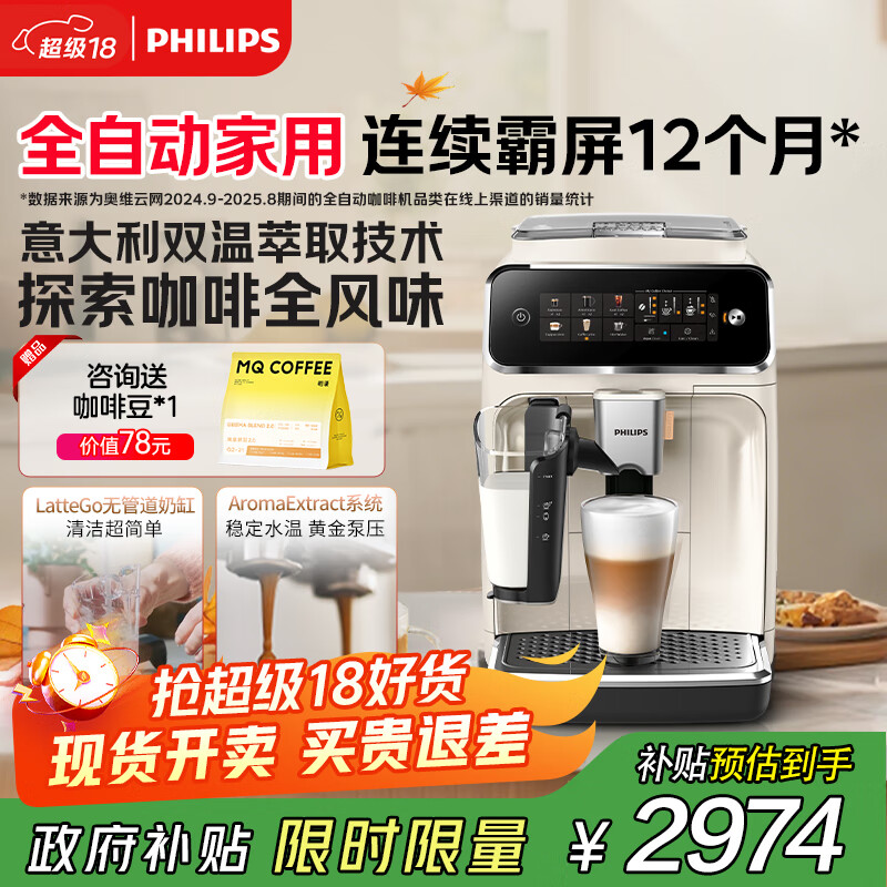 飞利浦(PHILIPS)【政府补贴】云朵咖啡机新3系EP3341/89家用/办公室全自动意式浓缩低温冷萃全自动咖啡机 送礼