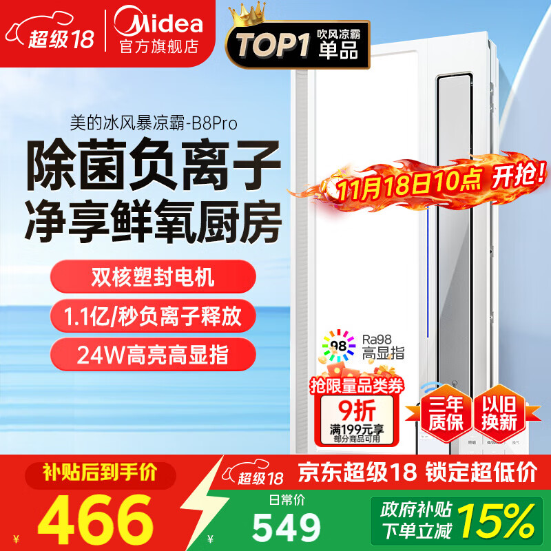 美的(Midea)凉霸厨房卫生间集成吊顶照明一体遥控排气换气吹风负离子除菌B8P