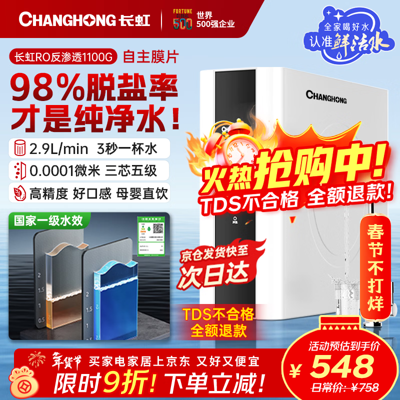 长虹(CHANGHONG)厨下家用净水器100G一级能效 0阻垢剂 母婴直饮0陈水 2.9L大流量流速 长效RO反渗透直饮过滤净水机
