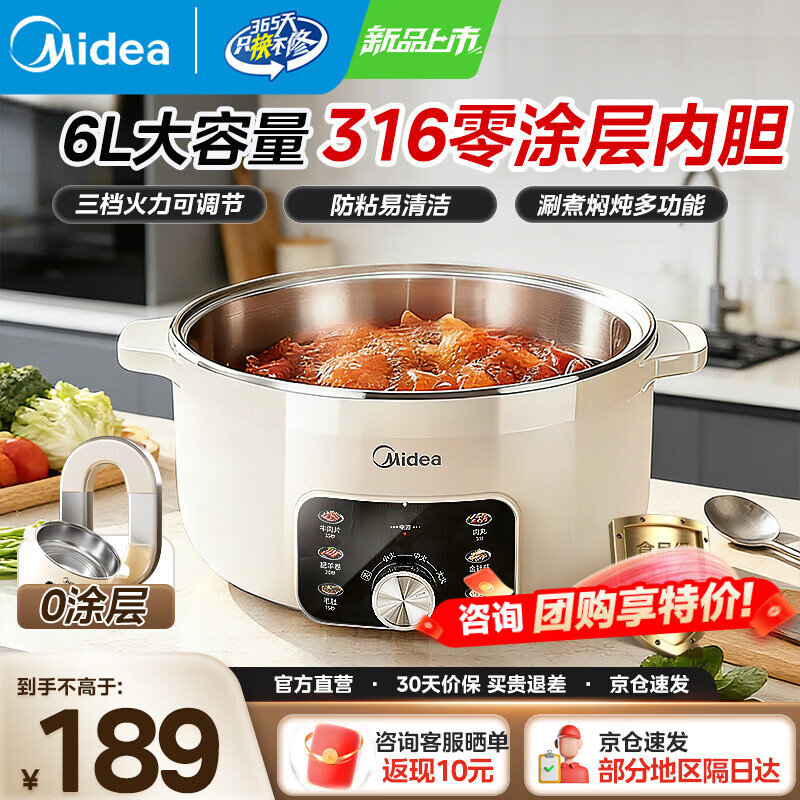 美的火锅电煮锅0涂层316L不锈钢内胆电火锅 2026新款多功能一体电锅2-3-4个人火锅专用锅 宿舍泡面锅 6L 【1800W母婴级316L加大加深内胆】