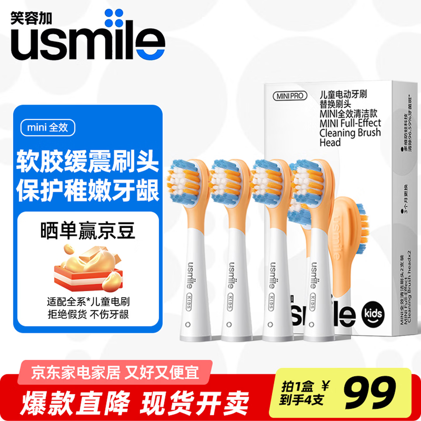usmile笑容加儿童电动牙刷刷头 全效呵护儿童牙齿3-12岁儿童适配usmile儿童电动牙刷A10Q10Q20替换牙刷头 4支 MINI全效清洁刷-橙色