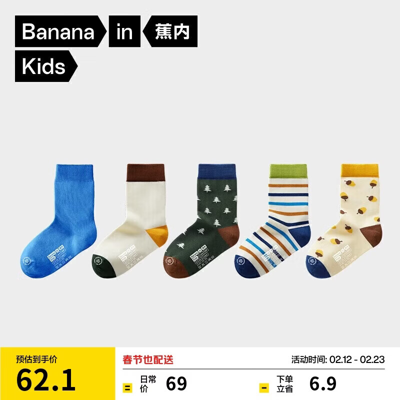 蕉内301C儿童袜子中筒宝宝男女童透气亲肤舒适7A抗菌防臭四季可穿5双