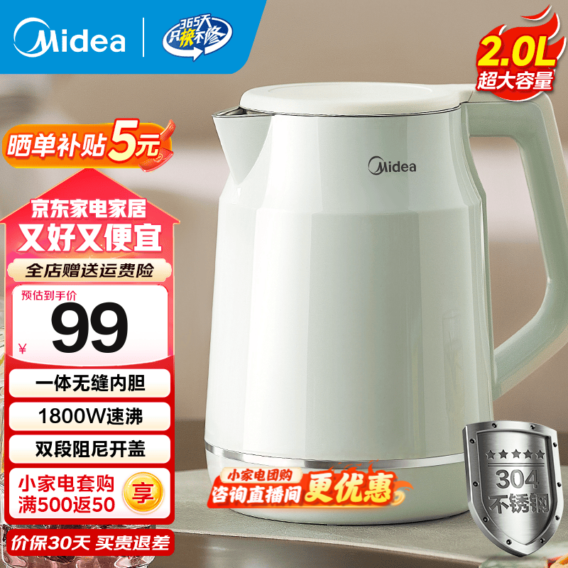 美的(Midea)电热水壶 2L大容量 1800W大功率速沸 双层防烫 304不锈钢无缝内胆 烧水壶电水壶年货 2L 【一体内胆】双层防烫