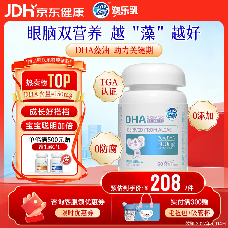 澳乐乳(OZ Good Dairy)【亲宝宝】植物DHA藻油澳洲原装进口 致鲜DHA60粒 60粒*1瓶 (买1赠1)