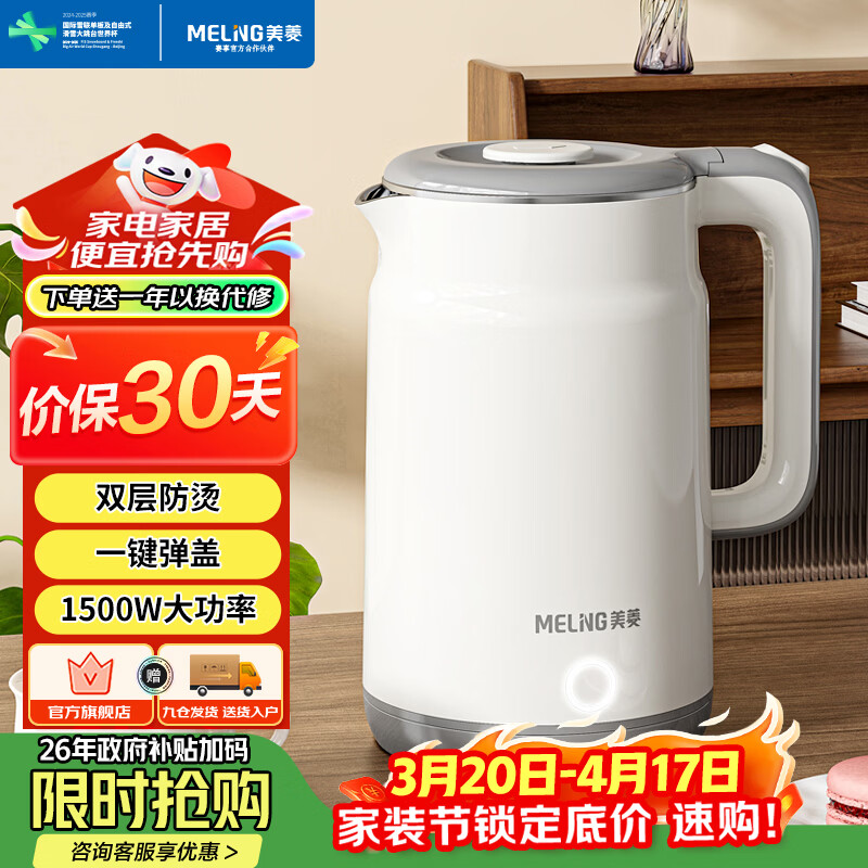 美菱(MeiLing)烧水壶电水壶热水壶电热水壶家用双层防烫1.7L大容量内胆304不锈钢MH-D601