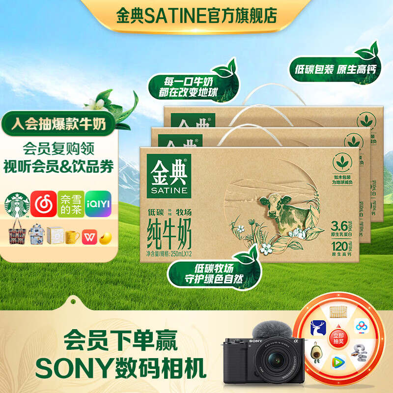 金典(SATINE)纯牛奶 3.6g乳蛋白 原生高钙 伊利牛奶整箱送礼 新鲜日期2月产 金典纯牛奶250ml*12盒*3箱