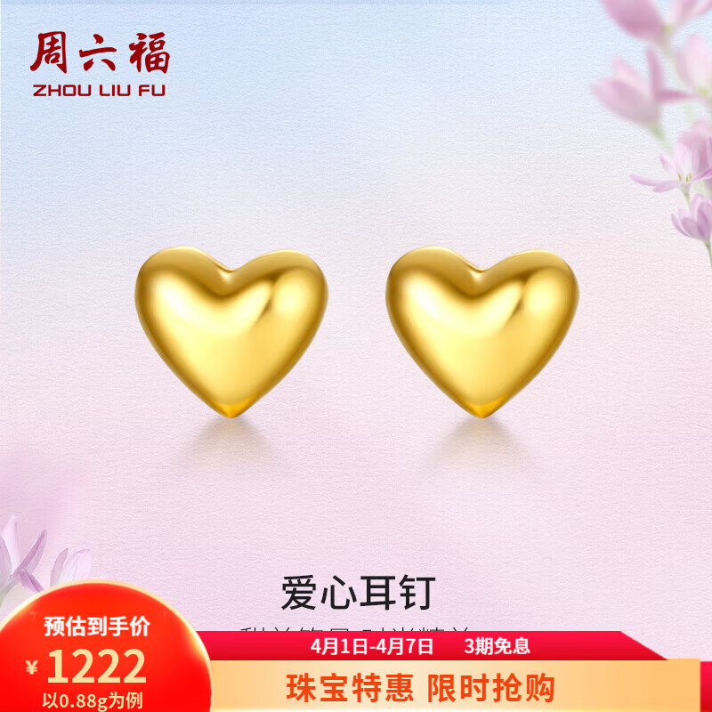 周六福(ZLF) 黄金耳钉女款足金999爱心型耳饰 计价 0.85g