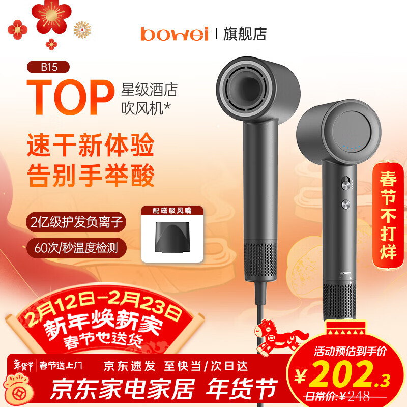 泊为(BOWEI)高速吹风机B15家用大风力速干负离子不伤发恒温低噪便携无叶电吹风筒新年情人节礼物星级酒店同款 B15太空灰 【星级酒店同款】