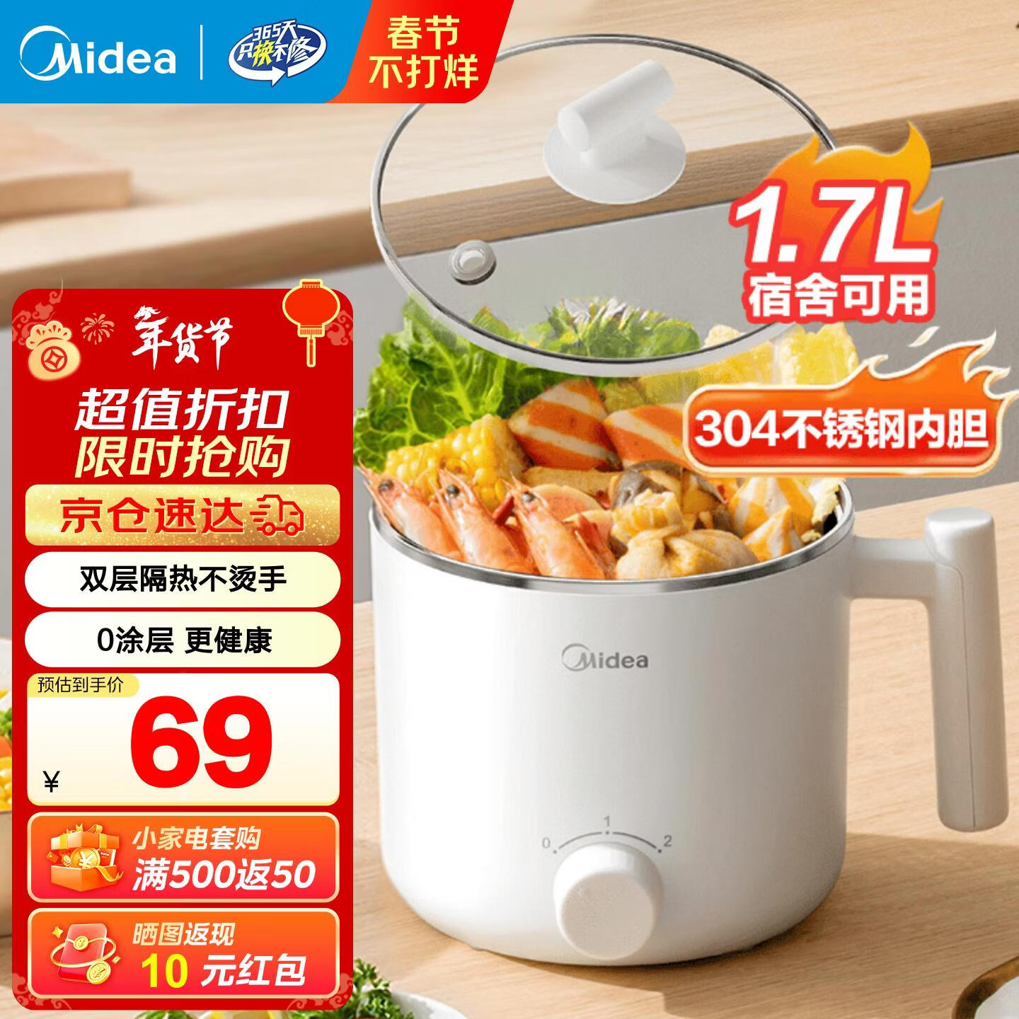 美的宿舍电煮锅不锈钢小型1-2人锅多功能一锅多用泡面锅小型迷你电煮锅小电锅1-2人便携式煮面锅电火锅 1.7L 【304内胆 0涂层】XZE1611