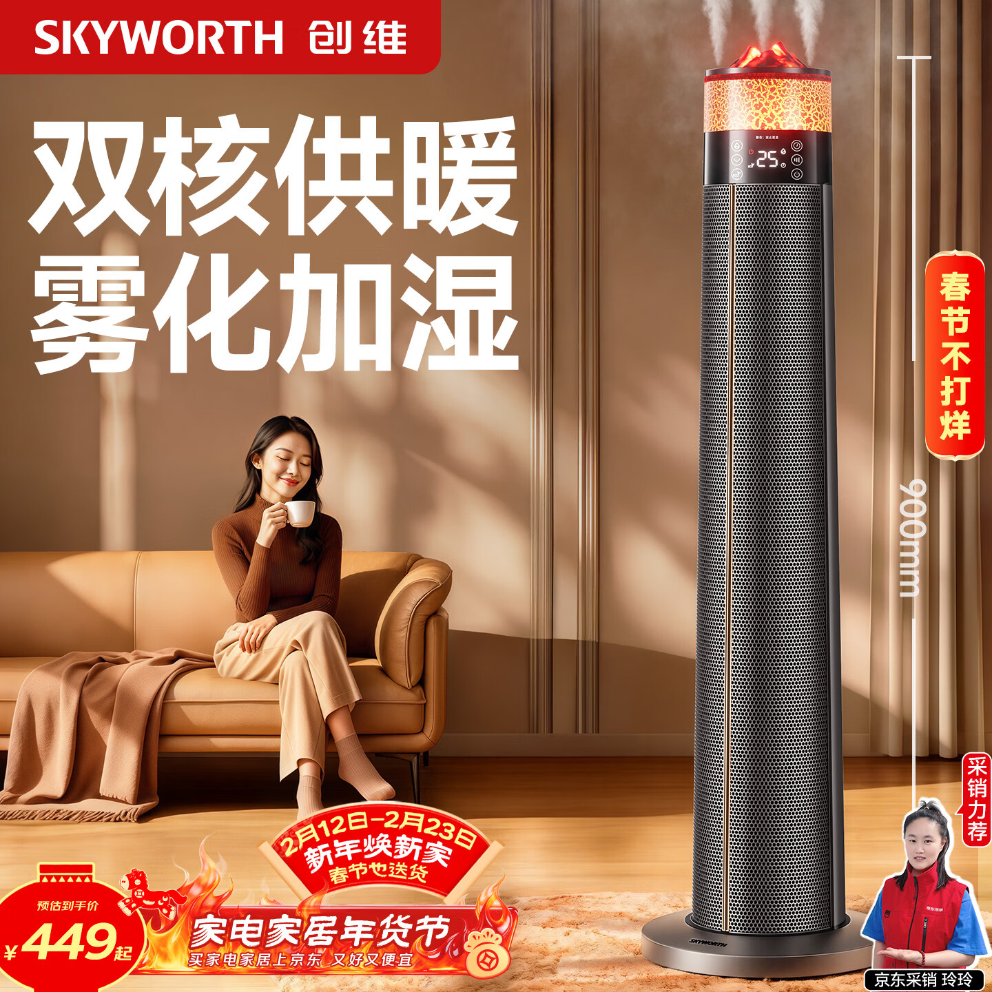 创维【火焰加湿】石墨烯取暖器节能电暖器家用大面积整屋速热升温智能温控加湿语音暖风机 A853