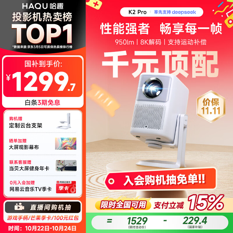 哈趣K2 Pro高亮版 投影仪家用 1080P高清 智能便携卧室家庭影院投影机 国家补贴(支持运动补偿)