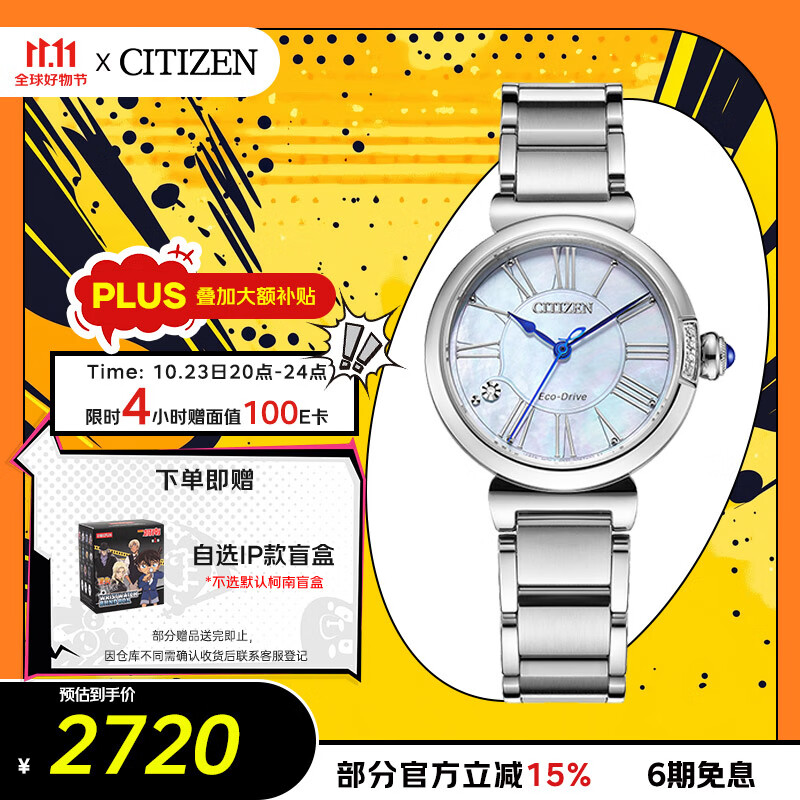 西铁城(CITIZEN)手表女日韩表小铃花光动能贝母盘钢带时尚送礼物女友EM1060-87N
