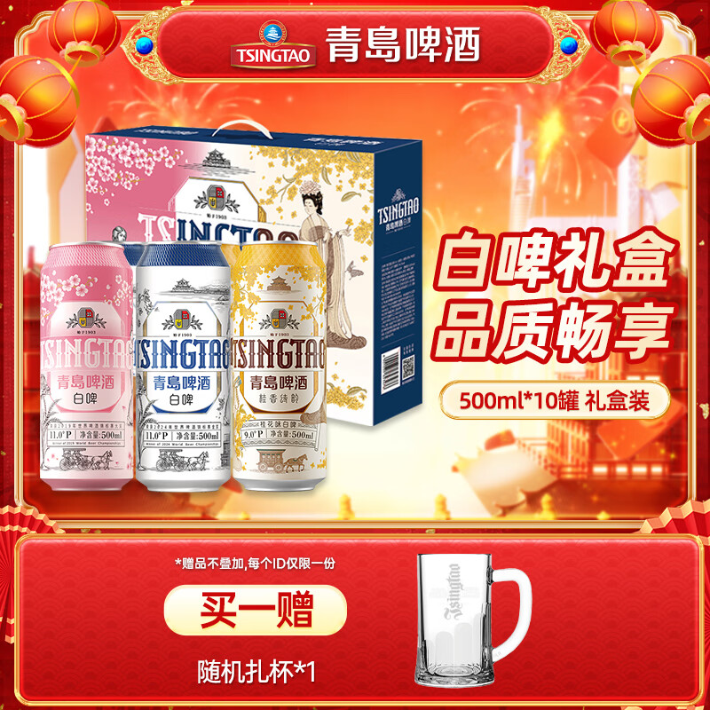 青岛啤酒(TsingTao)白啤酒礼盒500ml10罐佳节送礼(白啤4罐+樱花味3罐+桂花味3罐) 礼盒装