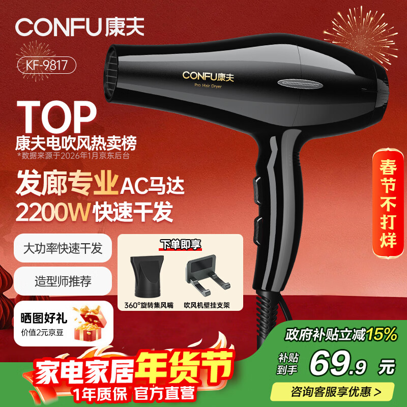 康夫(CONFU)【年货礼物】小家电吹风机家用发廊专业大风力恒温护发大功率速干吹风筒生日情人节礼物 9817【发廊大风力款】2200W