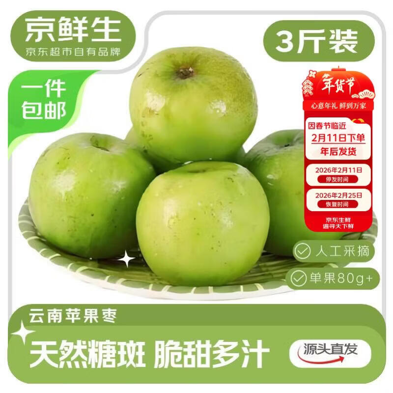 京鲜生 云南苹果枣 净重3斤 单果80g+ 新鲜水果 源头直发包邮