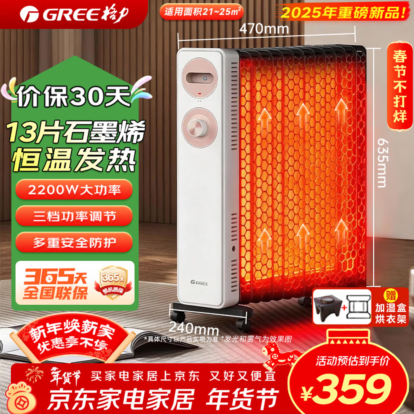 格力(GREE)【2025重磅新品】家用取暖器13片加宽片石墨烯电油汀电暖气防烫速热加湿烘衣电热油汀NY25-J6022-M