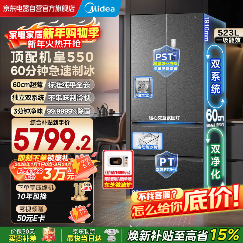 美的(Midea)机皇550法式多门超薄纯平全嵌一级除菌净味双系统大容量家用制冰一体机冰箱MR-550WUFIPZE海贝黛