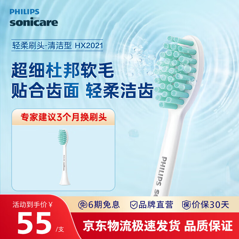飞利浦(PHILIPS)电动牙刷头轻柔洁净型适用2471/2451/2428/2481官方旗舰店 杜邦刷毛-HX2021/021支