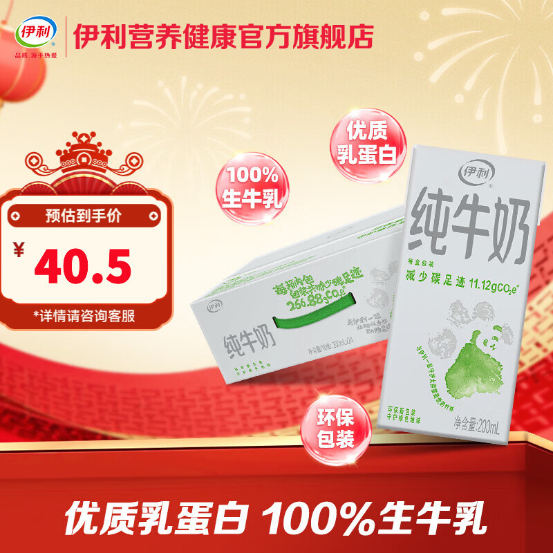 伊利 纯牛奶200ml*24盒/箱 全脂营养乳蛋白 环保装 11月产