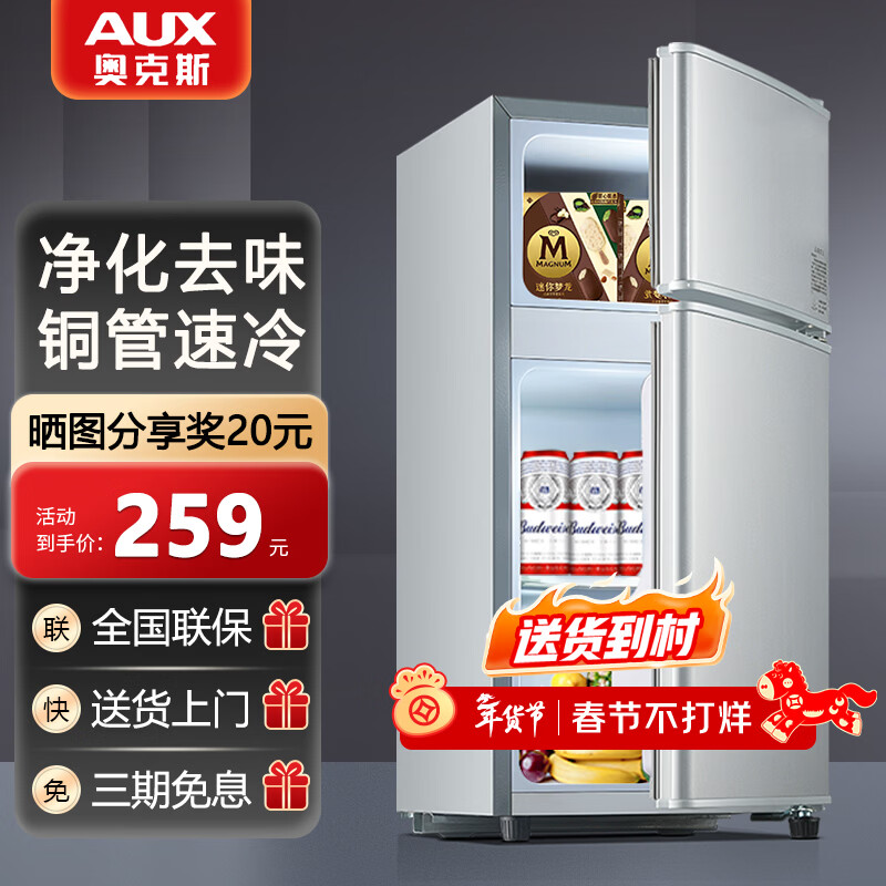奥克斯小冰箱家用小型迷你冷藏冷冻两用出租房宿舍用节能省电寝室办公室电冰箱 【净化去味】126银色【高效保鲜 铜管速冷】22L
