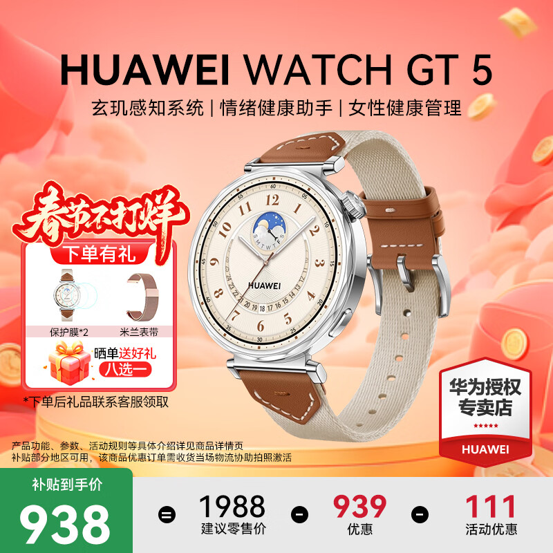 华为(HUAWEI)【咨询享优惠】WATCH GT 5智能手表运动玄玑感知血氧心率体温呼吸监测蓝牙通话防水男女健康情绪 41mm 马鞍棕-复合编织表带【送米兰表带+贴膜】