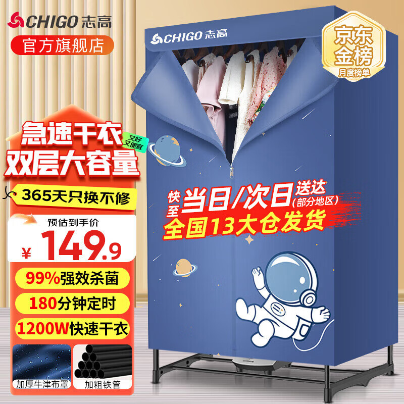 志高(CHIGO)烘干机家用干衣机小型衣柜式风干烘衣机婴儿衣服衣物暖风大容量双层定时烘干宿舍衣柜两用 【16根管】1200W+30斤承重+180分钟定时