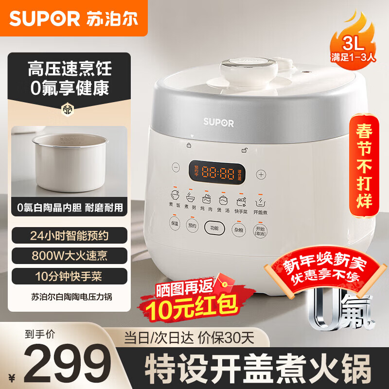 苏泊尔(SUPOR)电压力锅0氟电饭煲多功能压力锅1-3人压力煲煮饭煮粥锅火锅家用高颜值压力饭煲电饭锅 白色陶晶内胆 3L SY-30FC3006