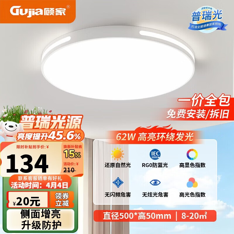 顾家led吸顶灯护眼普瑞光源简约客厅卧室灯具50cm圆-三色【包安装】