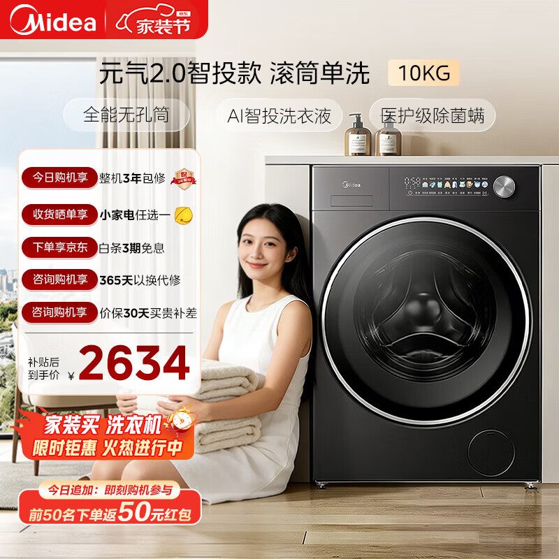 美的(Midea)元气2.0 滚筒洗衣机全自动 10KG 纯平全嵌 除菌除螨 智投 MG10S30T 以旧换新 补贴 京东自营