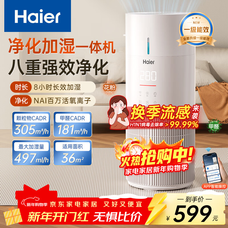 海尔(Haier)小白鲸【净化加湿一体机】家用卧室除甲醛除菌除烟味异味过敏源吸猫毛空气消毒机KJ300F-JSQ3U1