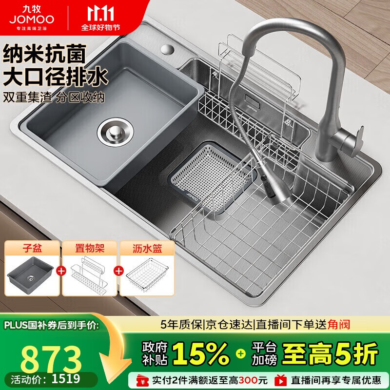 九牧(JOMOO)不锈钢多功能纳米灰大单槽集渣收纳水槽洗菜盆75*48含龙头02279