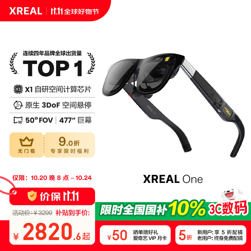 XREAL One AR智能眼镜 原生3DoF悬停 自研空间计算芯片 50°FOV 直连苹果16系列 非VRAI眼镜