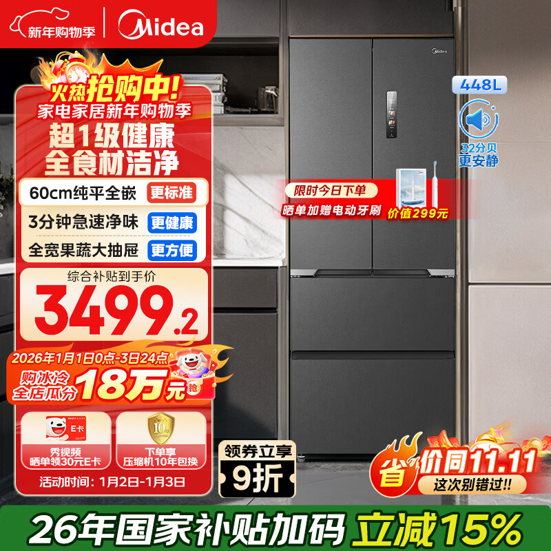 美的(Midea)448L法式多门冰箱超薄零嵌入式除菌净味一级能效风冷无霜变频节能以旧换新MR-470WUFPZE国家补贴