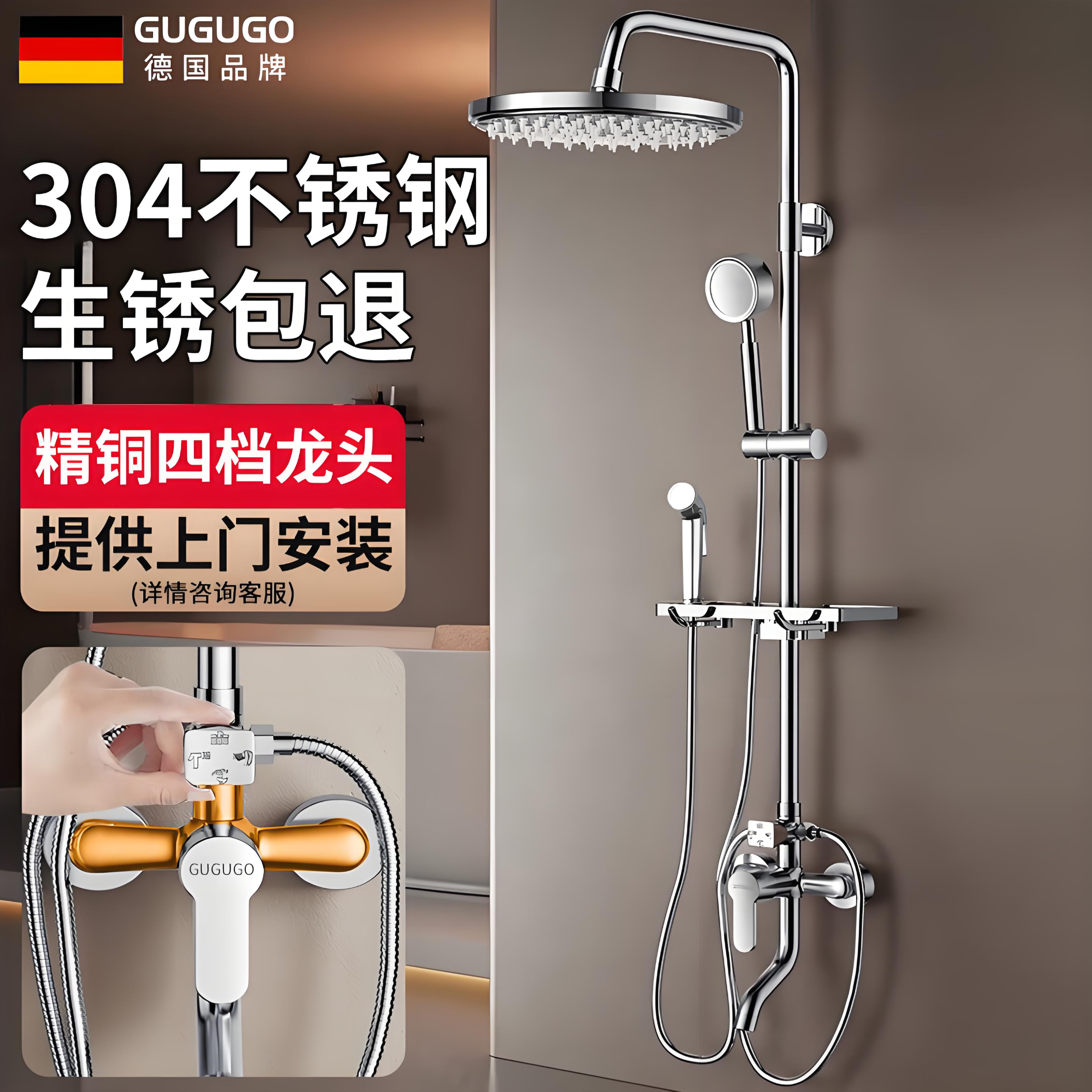 GuGuGo【德国】淋浴花洒套装一体全铜增压花洒淋浴全套一整套2025新款 【精铜主体】淋浴花洒套装 加厚精铜主体丨304增压顶喷丨送宽大置物架