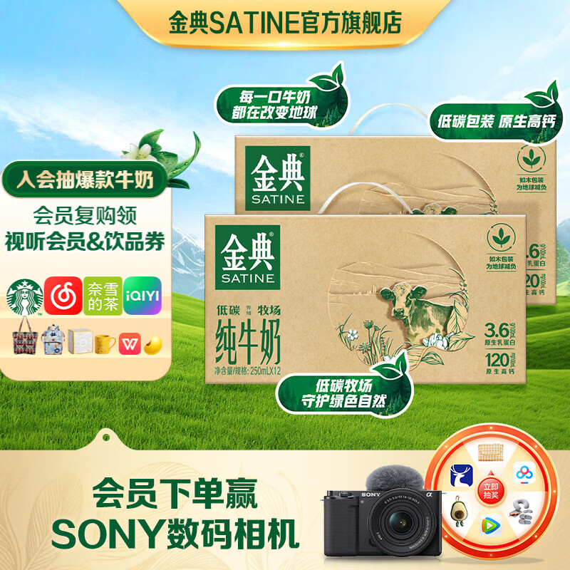 金典(SATINE)纯牛奶 3.6g乳蛋白 原生高钙 伊利牛奶整箱礼盒 新鲜日期2月产 纯牛奶250ml*12盒*2箱